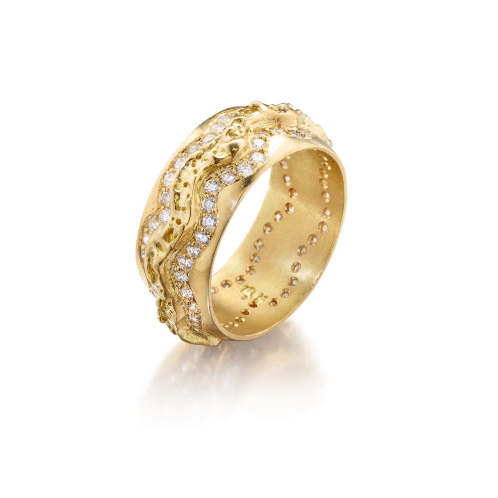 Ocean inspired 18k gold and diamond ring is set with 2mm white diamonds.